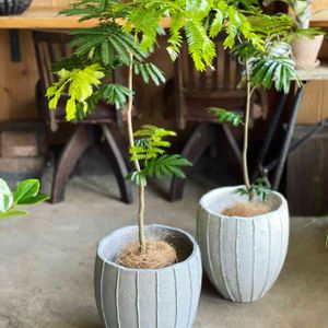 #cojobaarboreavarangustifolia #ネムノキエバーフレッシュ が入荷しました。 明るい黄緑色の新芽が美しい。 個体差がありますが、100〜120cmの良いサイズ感。(曲がり仕立てではなくナチュラルな樹形です) 鉢カバーもよいものが揃っていますよ。