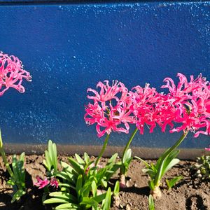 今日のお花 ネリネ この前車で通り掛かって見つけてたから遠回りしてコンビニまで歩いて行って撮って来ました💕 ブルーの壁が色を引き立てますね~ 🏷️木曜日は桃色