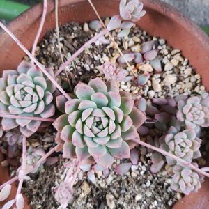 こんばんは 今日は秋晴れ 気持ちいい1日でした🎵 こちらは 「プロリフェラ」「プロリフィカ」さん 親株が木質化し ランナーぴょぴょんだったので 仕立て直し ほんのりピンク味 可愛い‼️