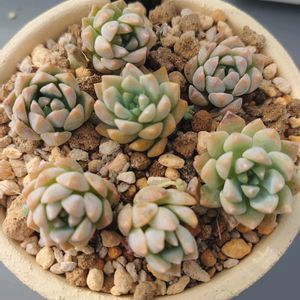 ネームプレートの冒頭 『小さなエケベリアっぽいですがセダム』でハート💘を撃ち抜かれ、 『脇芽から子株がどんどん出ます』 で、買い物カゴへ🛒 『寒い時期はピンクに紅葉します』 もっと大きな鉢に引っ越そうね🚚 これ、一株です (追記; 今はエケベリア・プロリフィカが正しく、属が変わった時に名前も変わったようです) 👆️やっぱり… セダムにしては… と、思っていました(´-﹏-`;)