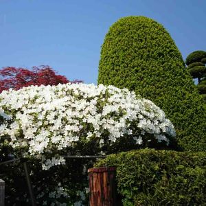 庭の白くて大きなツツジと、八重咲き山吹咲いてます 築山の南側の通路がお花たちで、見えなくなりました 昔から咲いてきた大盃のようなツツジで広がっています