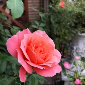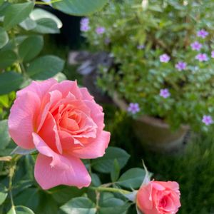 もう1枚は華やかなボリュデュール・アプリコ🌹 日々草を背景に、輝くように咲いてました✨🧡 日々草はそろそろ終わりかな🙄