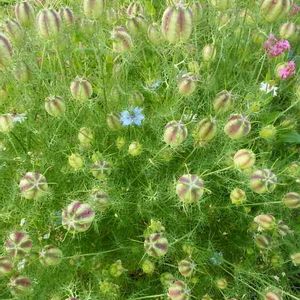 今晩は。 久しぶりのニゲラです。花後沢山の種の風船が膨らんでいます。 ピンクは虫取りナデシコです。