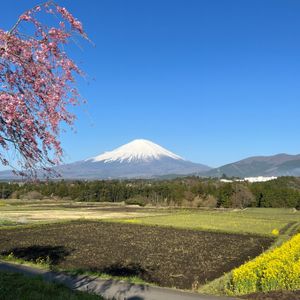 今朝の富士山🗻と、枝垂れ桜と菜の花 (2023.4.1. 7:28 小山町文化会館より)