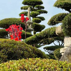 富士山を撮りに行く途中、植え込みが立派なお庭発見💚 赤いカンナの花が、塔の側で彩りを添えていました♥️ 刈り込みが綺麗で、爽やかな風が吹き抜けていました🩵
