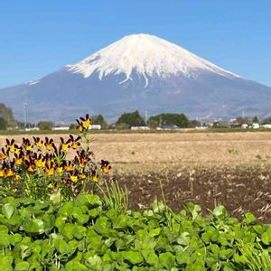 芝桜の富士山と、本物の富士山が青空に映えてます‼️ 小山町北郷地区の、田んぼの土手に植えられた芝桜たち チューリップや、ムスカリもたくさん植えられています