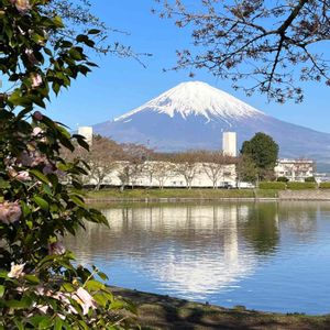 今朝の逆さ富士と、椿の花 (2023.4.10 7:30 御殿場市 東山湖より)