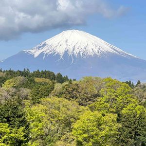 今朝の富士山と萌黄色の木々 (2023.4.12 8:50 小山町 足柄千保より)