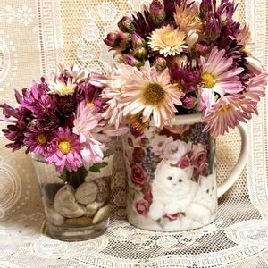 my gardenさんから頂いた菊のブーケをマグカップとガラス容器に飾りました(* 'ᵕ' )☆