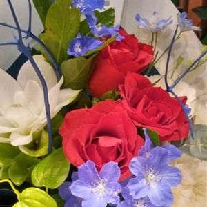 こんばんはヾ(o゚x゚o)ノ 青山発…ミニブーケ💐 真っ赤な薔薇にブルーのお花 いかがですか?☺️ ¥3960の 癒しかな?🤭 🏷️日曜日はバラよ♥️