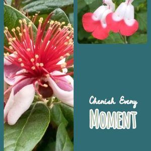 こんにちは✨☀️✨ ちょうど1ヶ月前の出会い🚶♀️ チェリーセージ🍒&フェイジョア♡ 2つのお花の花言葉♡♡ 燃ゆる思い…燃える心… 偶然に? 並んで咲いていました♡♡ 🏷️しあわせ運べるように 🏷️ニコニコ日曜日 参加させてくださいね♡