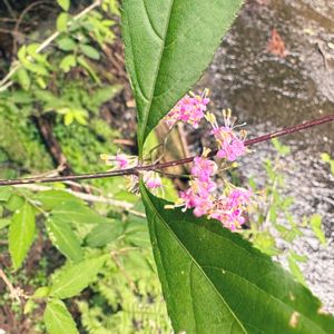 ムラサキシキブ 1️⃣ シソ科 ムラサキシキブ属 落葉低木 高さ5mに達する事も、普通3m位 🌸🌷は腋生するか、又は葉腋の少し上部から出る集散花序に付く 今までは花序が葉腋から離れて出るのはコムラサキと思っていたが数えて見ると半半位で冬芽(極小さい白い芽)の有る所ははっきり離れている。