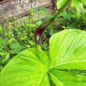 ムラサキオオハンゲ サトイモ科 ハンゲ属 常緑樹林内の日陰に生える オオハンゲの仏炎苞は普通緑色、紫色のものをムラサキオオハンゲと言う。オオハンゲに混じって散生する 本(近畿地方以西)、四、九、沖 に分布する