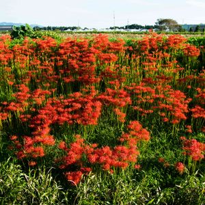 津市身美濃屋川堤のヒガンバナ いっそ半田市まで行こうかと思ったのですが,すぐ近所にもヒガンバナの綺麗な場所がありました。朝早くで光線が控えめですが,とっても濃い赤い色が表現できたのではないかと思います。