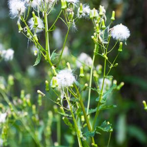 ダム湖沿いの道の斜面に広がるオオアレチノギク ここでは,沢山集まって咲いていて,白い綿毛が開いたものが沢山見られました。