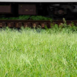 空き地を埋め尽くしたメヒシバと近鉄電車 線路脇の空き地がメヒシバで占有されています,先頭電車がさしかかった絵を撮ろうと思ったのですが,横方向の動きは速く,やや失敗作。