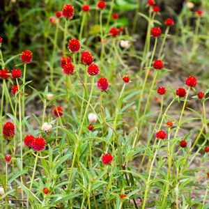 畑の横に咲いたキバナセンニチコウ 散歩の最中に赤い綺麗なポンポンを見かけました。センニチコウよりも葉っぱが細い,綺麗な赤い花が特徴です。キバナ,なのは,赤い舌状花の内側の筒状花が黄色いから,と言うことです。
