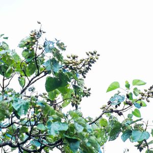 キリの大木に沢山実がついています。 ダム湖を周回する沢沿いの道の10mくらいの大木に大きな葉っぱ,てっぺんの枝にたくさんの尖った実がついています。中には風に乗って運ばれるタネが詰まっています。