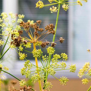 フェンネルのタネが一杯 キャンパスの植え込みの角にタネを付けた巨大なネギボウズ状のものが! タネをかじってみると,すごく良い香りと強い甘み。根っこが太い玉の様ですから,フェンネルと思います。