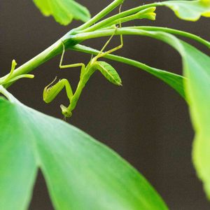 キャンパスのイチョウの葉っぱを撮影して回っていると,枝に忍者が居ました。 ぱっと見では気がつかず,カメラを向けて何枚か撮るうちに小さなカマキリが居るのに気がつきました。