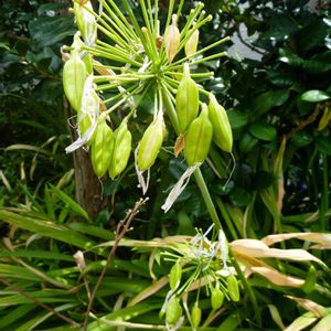 アガパンサスの花その後 しおれた花の根元が膨らんで実ができています。棒だけになってしまっているところは、受粉しなかったのでしょうか?近くの自分以外の花を訪れた虫がこの花に来てくれる確率がこれくらいなのでしょうか?