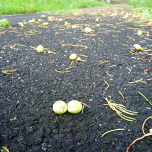 台風で落下したイチョウの実 週末の台風は,猛スピードで通り過ぎ,雨はたいしたことなかった印象でしたが,風が強かったので,月曜朝に出勤してみるとキャンパスのイチョウの木の下には沢山もぎ取られてしまった実が落ちていました。
