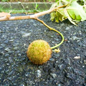 週末の台風12号は風が強い台風でした。 月曜日の朝,キャンパスに出勤してみると,ちぎれた枝や落ちた実が沢山散らばっていました。プラタナスの実が小さな枝ごともぎ取られて落ちていました。かわいそうな気がします。