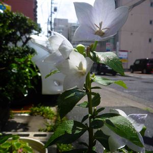土曜日の台風は急ぎ足で過ぎましたが,次ぐ日曜日も突然雨が降ったり不安定な天気。台風一過の青空が午後になってようやく現れました。青空に映える白いキキョウを名古屋の街中で見かけました。この直前も降っていたため,葉が濡れて光っています。