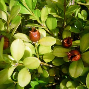 キャンパスのツゲの実 ツゲ(あるいは,セイヨウツゲ)の実がおもしろいです。2つセットの突起が120度三角の位置についています。この二つの間が割れて中からタネがが出るそうです。この写真でもすこし割れ始めています。