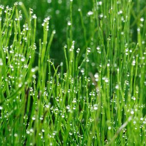 朝露を抱いたスギナ 線路の法面がスギナで覆われています。朝6:30,朝日で夜露が輝きます。