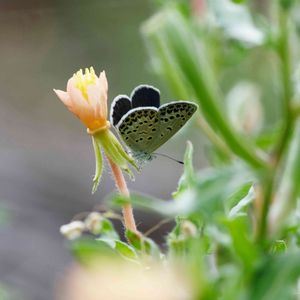 コマツヨイグサに訪れたヤマトシジミ 小さな蝶々を土手の斜面に這いつくばって,地面すれすれからショット!