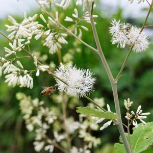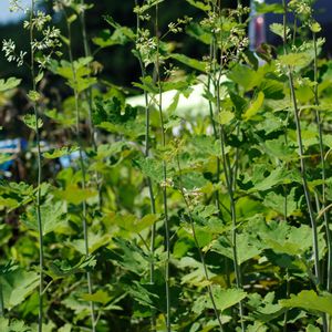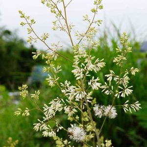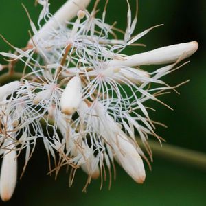 白い糸が吹き出すように咲くタケニグサの花 花の咲き始めに丁度出くわしました。白い糸が綺麗です。遠くから観ると雪が積もっているようにも見えます。盛んにハチが訪れていました。2018年6月24日,三重県いなべ市大安町,宇賀川河川敷にて。