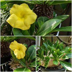 パキポディウム恵比寿笑い💛 実生の子はお日様ガンガンの方が調子良さそうですね🍀 いつの間に花芽が上がってたのかも気づかない内に今朝開花してました~💕 蕾も控えています😄 輸入株は葉っぱワシャワシャです🌿