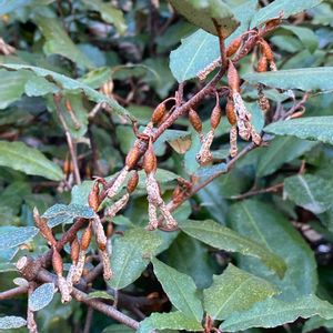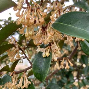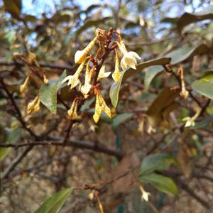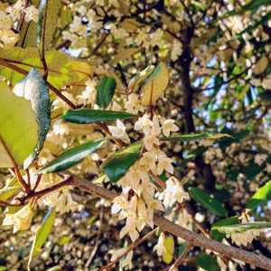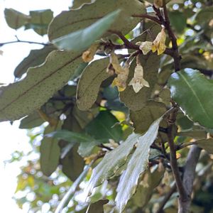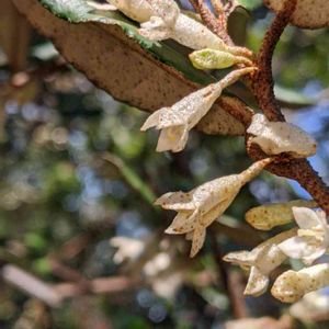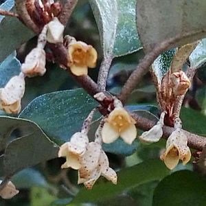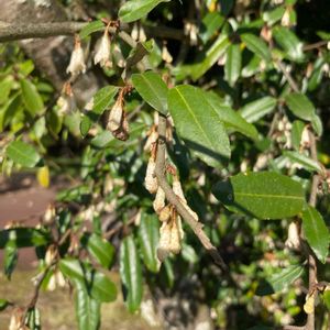 ナワシログミ 11/2に投稿した、ツルグミとは別の場所です。 似た木ではありますが、花は今回のほうが白っぽいです。 ナワシログミは葉が反っているとのこと……その通りですね💙😊 左下の写真の白っぽい所は、葉の裏側です。葉の表は緑、裏は白っぽい色をしています。