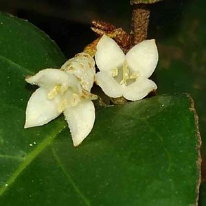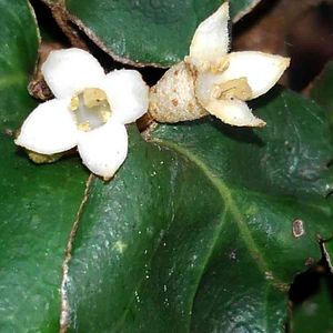 ハイキングコースの登り口近くで。 今頃 お花が見られるのですね🎵 (狂い咲きでは無いですね) 「ナワシログミ」です。