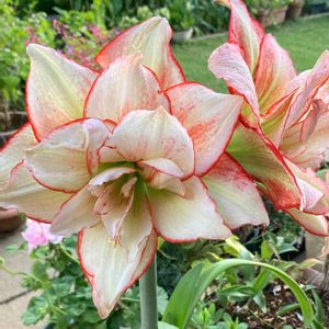 4月に90歳になった花友さんから 頂いた八重咲きアマリリスが咲きました🌱 3つも蕾をつけています♪♪♪ この友人は、いろんな植栽をひとりで育てている、とても元気なお婆ちゃまです👍 わが家の前を通るのがお散歩コースです🚶♀️