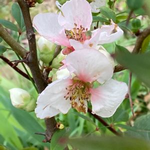 南天の陰からコンニチワ♪ 淡い色みのボケの花です🌱 優しい感じがたまりません💕