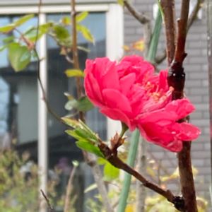 鮮やかなピンク色の桃の花が3輪咲いてくれました❣️ 家の建替え時に挿木しておいたものです! 大きな木だったので、やむ無くサヨナラしましたが、、 挿木しておいて良かったです👍 初開花です🌱