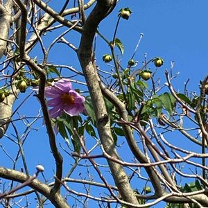 皇帝ダリア、高過ぎて蕾に気が付かず、お花が咲いてやっと気が付きました😁💕 葉っぱが落ちたハナミズキに、ダリアの花を咲かせたくて😊🌸 まだ花茎一本ですが、もっとたくさん増えたら寂しくなったハナミズキが華やかに🤗💕
