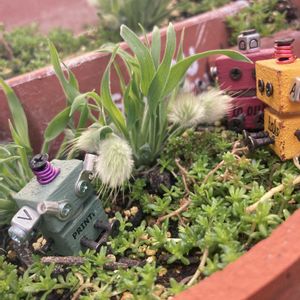 🤖これなぁに?ふわふわだね 🤖ラグラスって言うんだよ✨ フワフワのラグラスにロボ達も気持ち良さそうです゚・*:.。. .。.:*・゜ GSの繋がりでいただいたラグラスの種かこんなに増えました🤭 畑に蒔いたらすんげぇデカくなったよ🤭