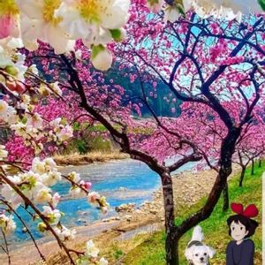 キキちゃんと 春爛漫のお花見 レオもごきげん♡ ①ごろちゃん作 ②③今朝の桜散歩🌸 ④びわの赤ちゃん ⑤垣根のベニアカネ、蕾です💕
