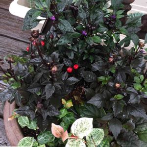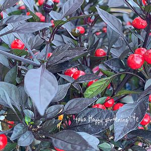鑑賞用トウガラシ「パープルフラッシュ」「ブラックパール」 名前が はっきり わかりませんが… 👇👇 「オニキスレッド」と、わかりました。 濃い緑色~紫の 葉っぱ 紫色の花 その後 実が ツヤツヤで 光っています。 紫🟣~黒⚫️ 緑色🟢の時もあります。 そして、実が熟すと赤🔴になります。 実の 色の 変化が 楽しめます。 ん〜(*´꒳`*)♡ ス・テ・キ♡💗