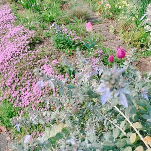 ピンクの絨毯やばいです💓 石積みもパンビオものみ込まれていますヾ( 〃∇〃)ツ キャーーーッ♡ チューリップは水仙と背比べ🥰 フレンチラベンダーのお花もあがってきました💜 最後は、いつも名前を忘れてしまう小球根のお花。 毎年ちゃんと咲いてくれるのにごめんね😅