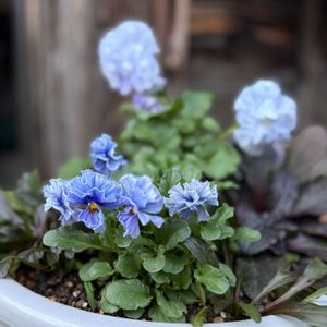初めて出会ったパンジーのシュガーボンボンが可愛くて、お迎えしたものの待機中でした😊 ①ビオレッタミニフリの寄せ植えにプラスしてみることに ②アップで✨繊細なフリルが素敵 ③ブルークローバーが開花! 植え付けて半年位経ちますが、こんな時期に咲くのかとびっくり🫢 綺麗なブルーです💙