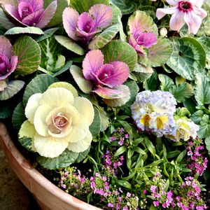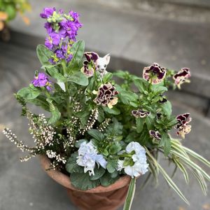 《 寄せ植え 》 ⚪︎パンジー シュガーボンボン ⚪︎ビオラ 藍月 ⚪︎葉牡丹 ラッフル ⚪︎スイートアリッサム 藍月の存在感が薄いので早くたくさん咲いて〜😅