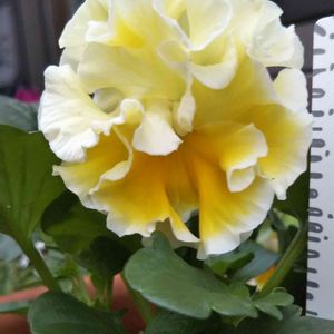 シュガーボンボン🥧🎶 純白のフリフリパンジーです😚 真ん中の黄身がとても可愛らしいっす🍳✨ ここまではっきりホワイトカラーでフリフリのパンジーはあまり見ない気もします🤔 下のボンボンがミルキーモモに乗っかってしまってるのはご愛敬です😆💦