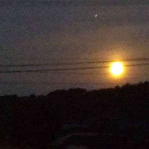 おはようございます🙋 今朝のお月様 左上には木星が見えます とても 紅いお月様🌕 左下の灯りは イチゴのビニールハウスです 一晩中灯りをつけて 昼間と勘違いさせて 花を咲かせるそうです🍓🍓