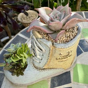 寄せ植えの記録です。 数年前から「小学校の寄せ植え」として引き継いできた寄せ植えがあったのですが(写真5枚目)、相当のびのびゲソゲソになっていたので更新をしました。 といっても、実際に解体してみたら、ほとんど使える苗がなく… 引き継げたのは、アーモンドネックレスと、ピンクプリティっぽいエケベリア、紅稚児、くらいでした。 ブルースプルースっぽいレフレクサムは元気でしたが、増えすぎて収拾がつかなくなっていたので今回は入れませんでした。 似たような雰囲気のカゴ寄せ… 「つまり、わりと放置めでも行ける丈夫そうな種類を植える」 というコンセプトだけ引き継いだ感じです。 もはや「小学校の寄せ植え」…ではないですね。 前のカゴ寄せより一回り小さいのですが 「手提げカゴ寄せ」 と命名しておきます。 使った品種は 虹の玉、恋心、乙女心、桜牡丹ぽいグラプト、レティジア、秋麗、白牡丹、ピンクプリティぽいもの、紅稚児、ドラゴンズブラッド、アーモンドネックレス です。 隙間のセダムは今、コンディションがいいものがなかったのと、寄せ植えのメンテナンスが難しくなるのでほとんど入れませんでした。 やっぱり夏の後の自前苗での寄せ植え作りは難しいです…、 ちなみに虹の玉と乙女心は新たに購入したものです。 過去の様子は 🏷小学校の寄せ植え で見られます。 が、もはや今回はほぼ作り直しの別物ですが(笑)。