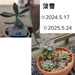 お花が終わって夏色になった朧月🌕さん。冬はピンクがかかり、夏は青みがかかります。 んん。白牡丹さんも紛れていますね👀。 流石ご親戚(白牡丹は朧月と静夜の交配種)です。同じ頃に青みがかかったようです。 ウォーリーを探せならぬ、白牡丹を探せ状態です😲。 ご興味がある方探してみて下さいませ🙇🏻♀️。 密かに白牡丹さんがアピールしています。 回答は2pic目です。赤丸が朧月さんです。😃 3pic目は白牡丹さんのお花です。 朧月さんも白牡丹さんも同じ時期に色違いと言っていいようなお花が咲きます。 朧月さんは白、白牡丹さんは黄色〜オレンジです。 本当はもうお花は終わりの時期です。 今年は白牡丹さんが今の鉢では転がりやすくなったのと白牡丹さんが鉢に体重をかけたらダイソーの300円植物の鉢にヒビが入りました。なので、咲いている白牡丹さんにお花が終わったら植え替えと言っていたら、新たに花芽を作り出したので、まだ咲いてます😲。 植え替えが嫌だったのかな😅。とりあえず次の成長期の秋まで今の鉢のままにします。