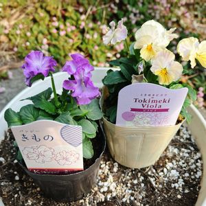 実家寄せ植え🌿✨ パンジー きもの ときめきビオラ ビリビリ